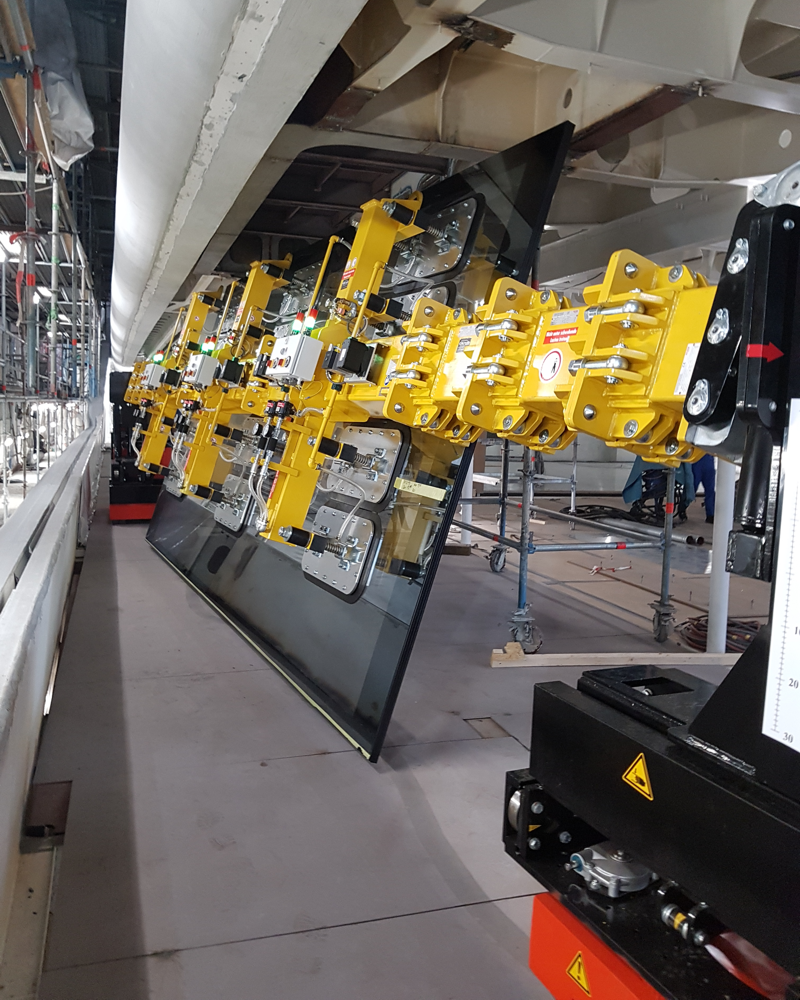 Der Glasboy 5300 ist eine Sonderanfertigung zur Verglasung von extrem schweren Glasscheiben. Auf unserem Foto oben handelte es sich um 1 Glasscheibe mit einer Länge von über 11000 cm und einer Höhe von ca. 3000 cm.
